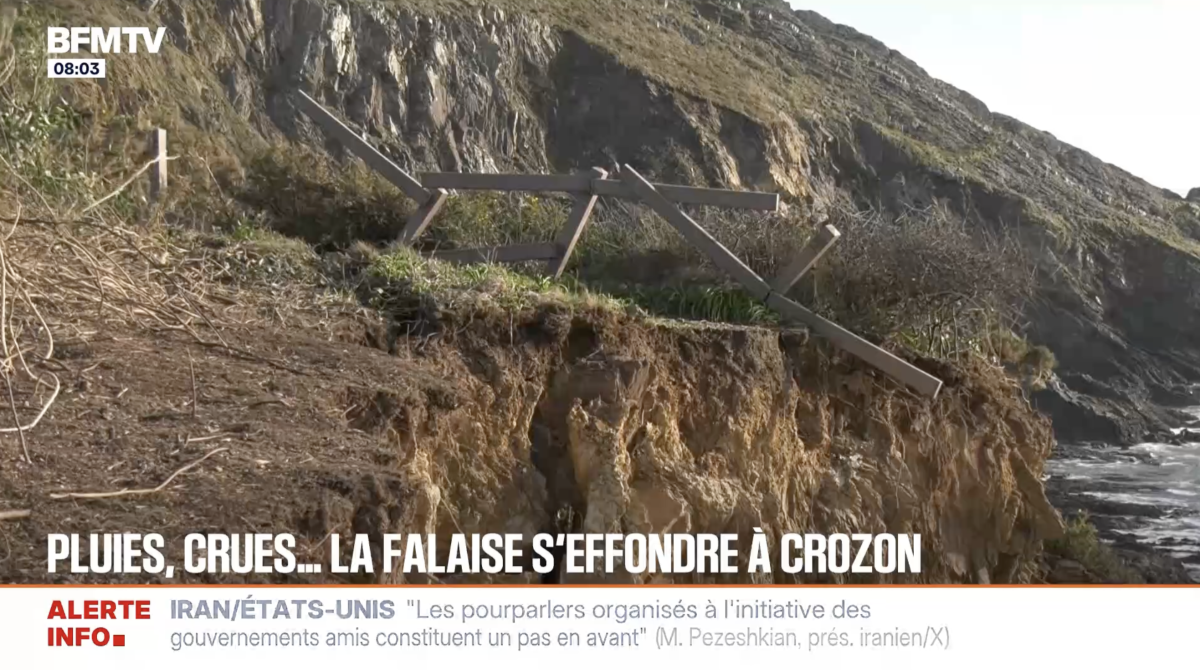 Les intempéries de janvier ont provoqué un effondrement notable sur les falaises de la presqu'île de Crozon, un phénomène causé par la combinaison de l'érosion marine et de l'infiltration des eaux de pluie qui saturent les sols.
